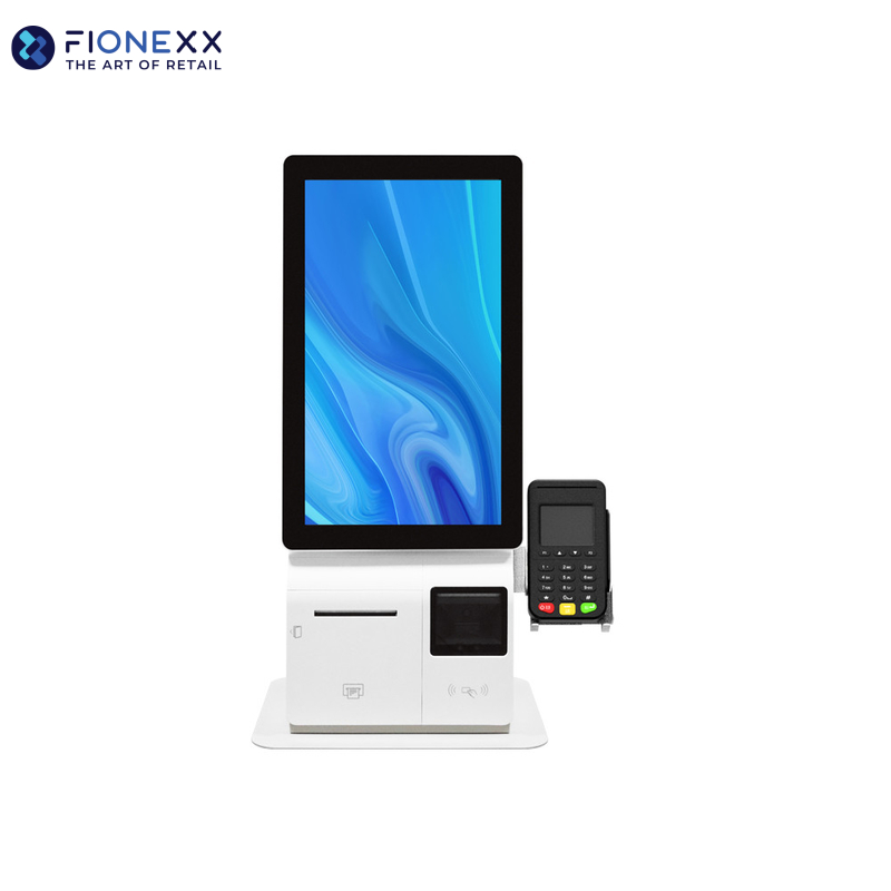 Borne de commande en libre-service, Conception robuste et compacte idéale pour les restaurants et les plats à emporter, avec imprimante intégrée et scanner QR haute vitesse.